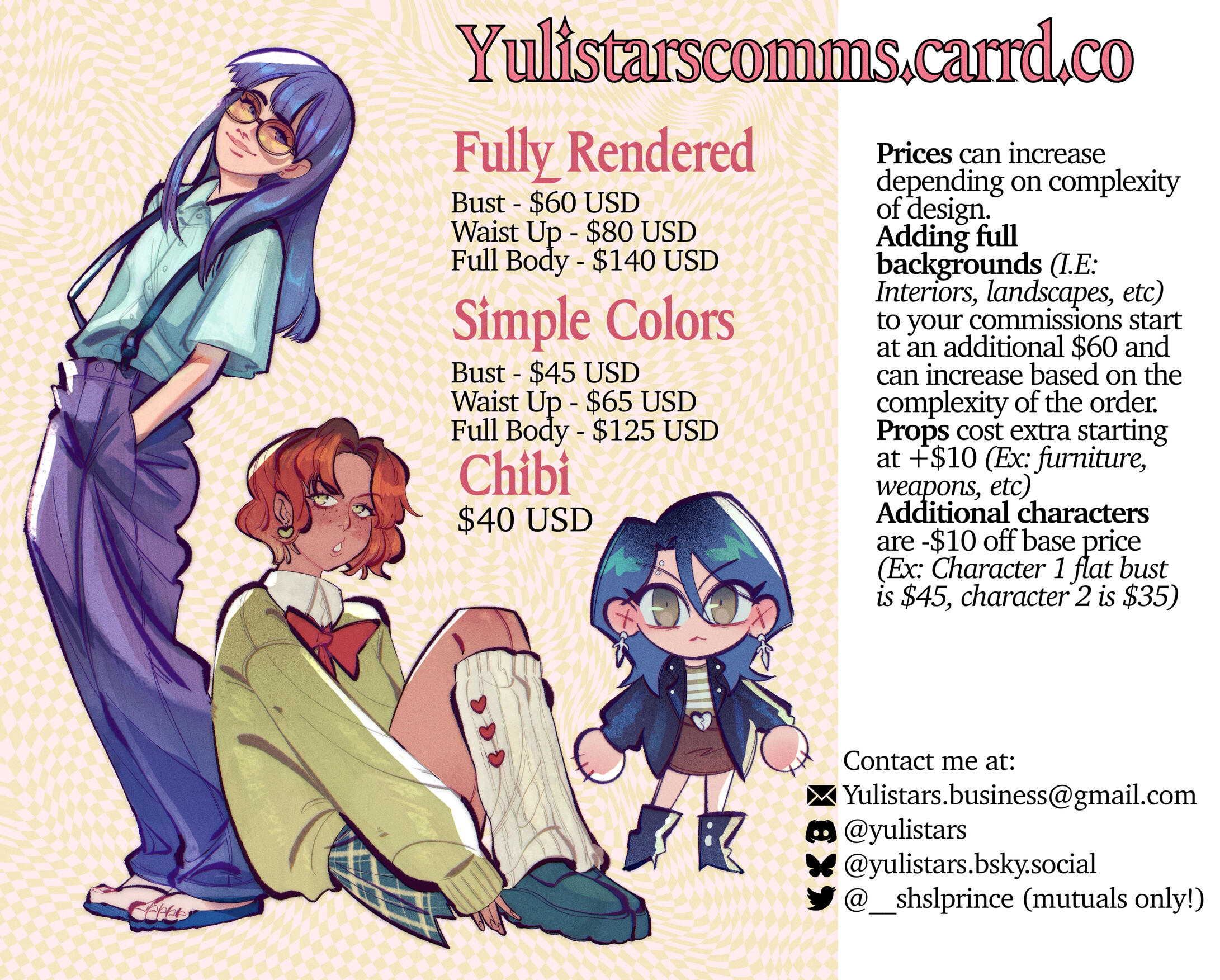 Adding full backgrounds (I.E: Interiors, landscapes, etc) to your commissions start at an additional $60 and can increase based on the complexity of the order.